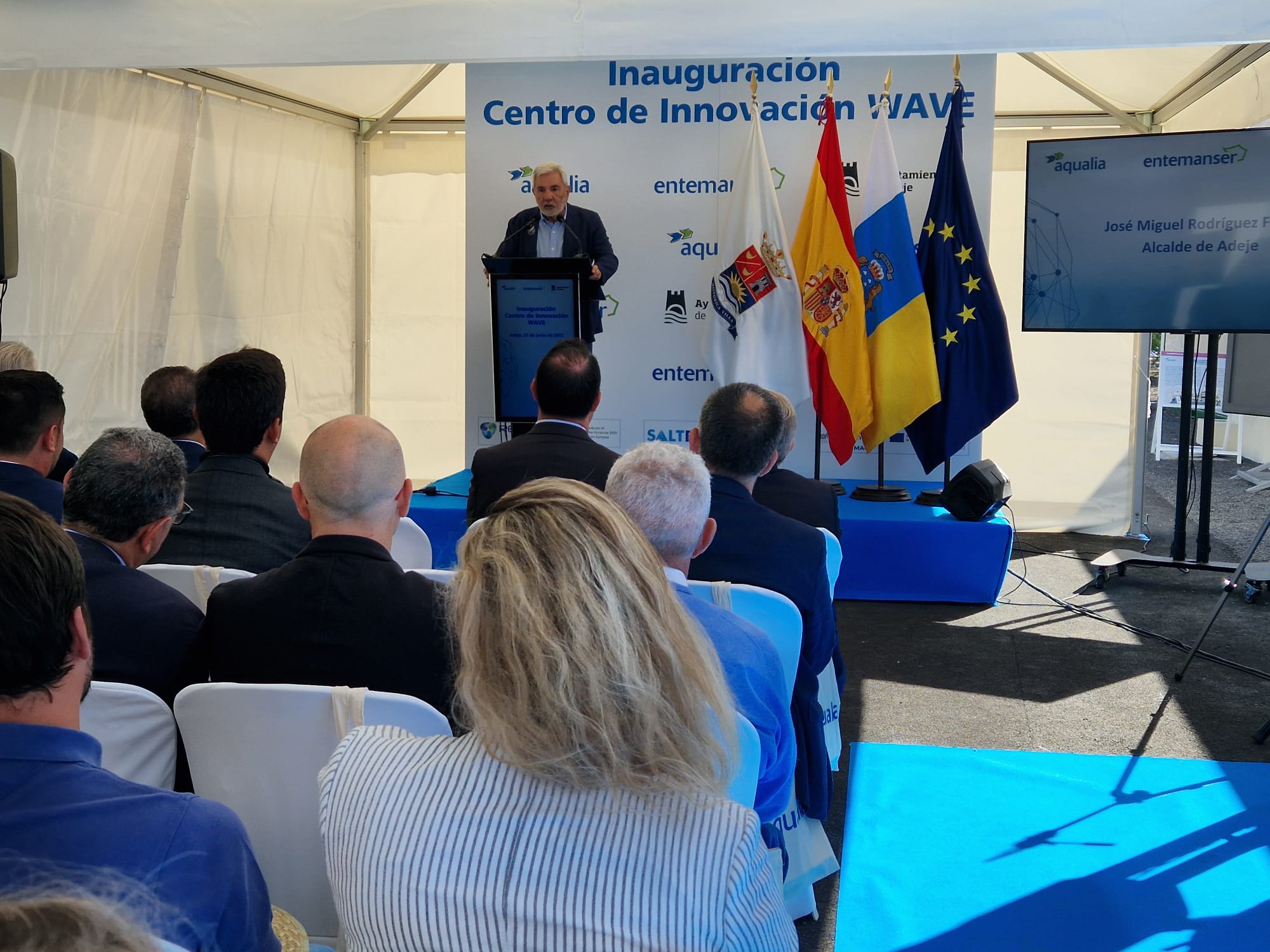 El acto se ha hecho coincidir con la celebración del XIV Congreso Internacional de la Asociación Española de Desalación y Reutilización (AEDYR), que se ha celebrado esta semana en Santa Cruz. Unas 100 personas, entre ellas varios delegados internacionales, han asistido al evento de inauguración del centro WAVE, que ha presidido el alcalde de Adeje, José Miguel Rodríguez Fraga, y ha contado con la presencia de diversas autoridades, así como responsables de Aqualia-Entemanser: Higinio Martínez, director territorial del sur de España; Pedro Rodríguez, director de Desarrollo Estratégico y Sostenibilidad; Enrique Reina, director de la delegación Canarias; y Víctor Monsalvo, responsable del Área de Ecoeficiencia en el departamento de Innovación y Tecnología.
