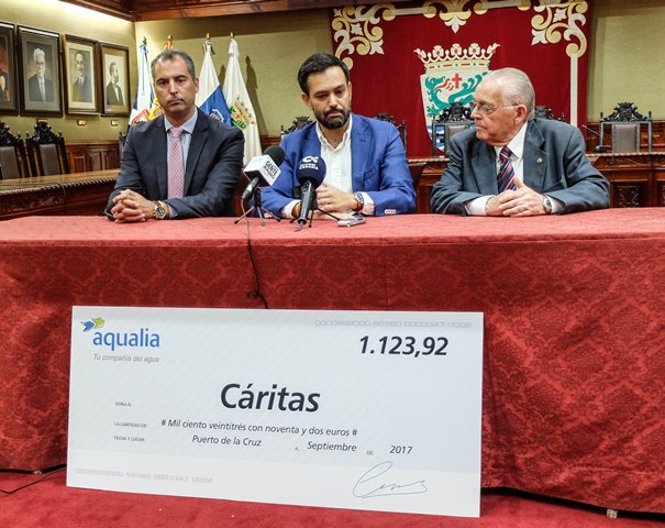 El director de la delegación de Aqualia en Canarias, acompañado por el alcalde del Puerto de la Cruz, ha entregado el talón al director de Cáritas Tenerife