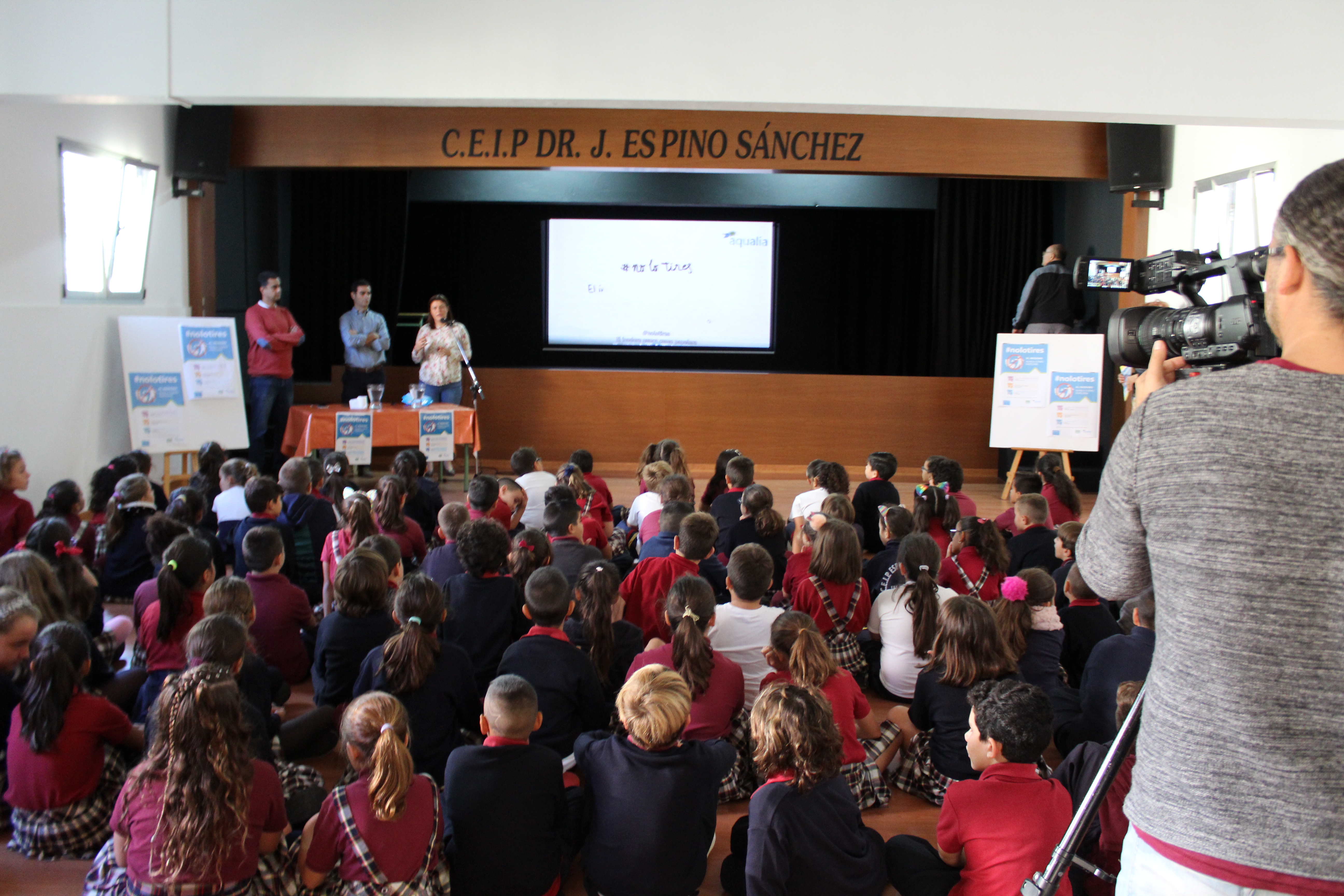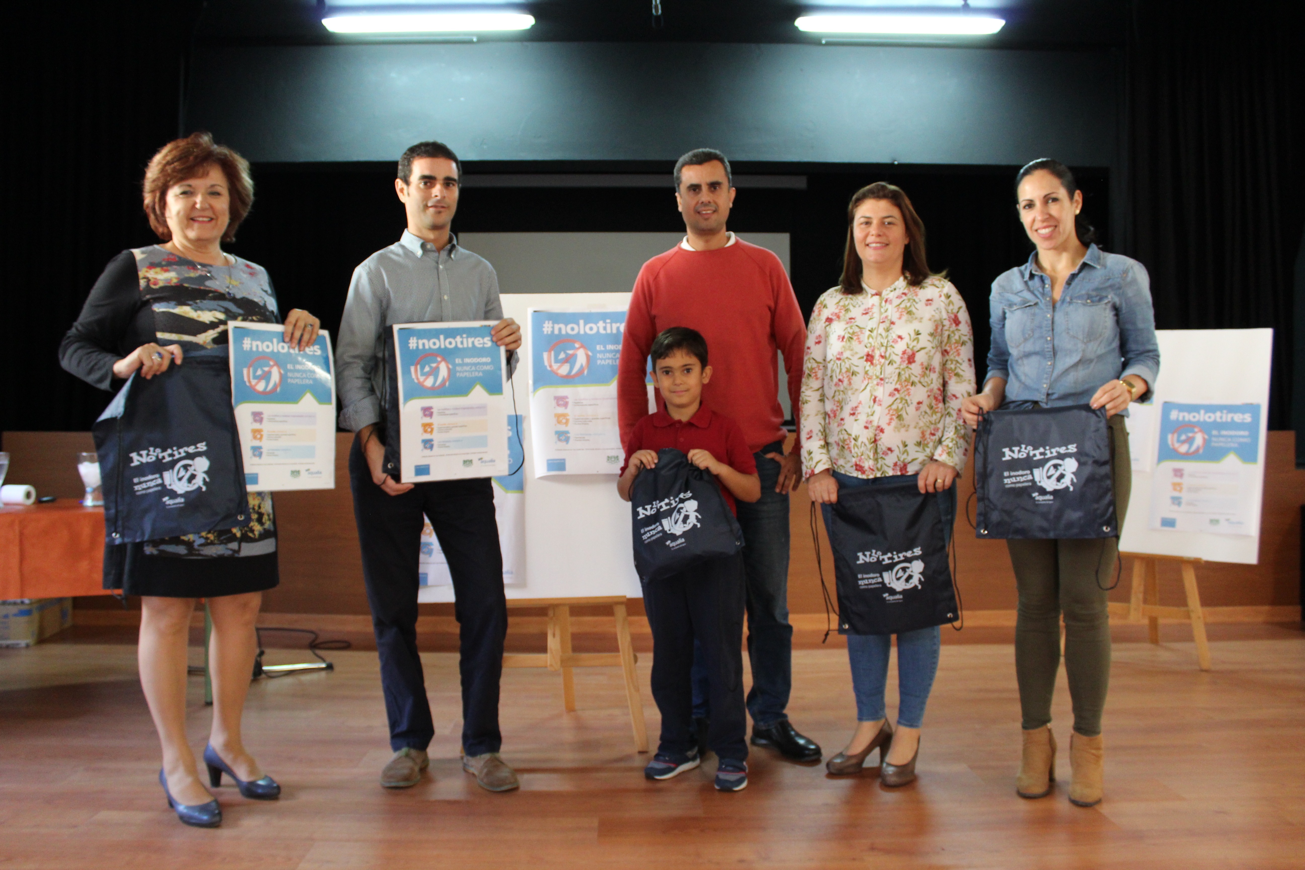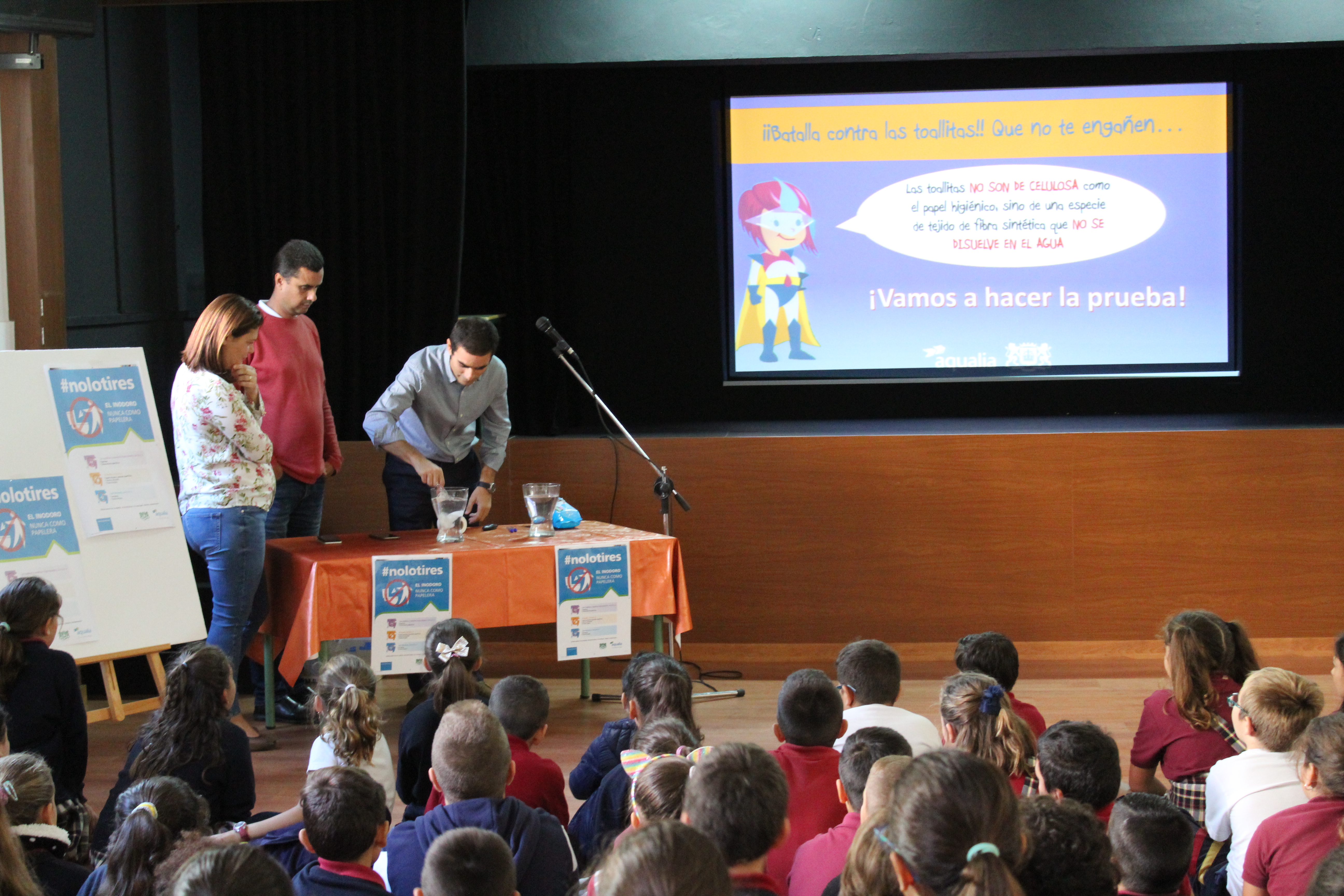 Tras la intervención de la edil del ayuntamiento, Héctor Pérez presentó los posters de la campaña #NoLoTires que ayuntamiento y empresa han pegado en los baños de todos los colegios e instalaciones deportivas municipales para posteriormente proyectar el vídeo divulgativo #Nolotires a través del cual se busca concienciar, informar y educar a la población sobre el buen uso del saneamiento y que presenta unos sencillos consejos con los que podemos prevenir averías y atascos.
