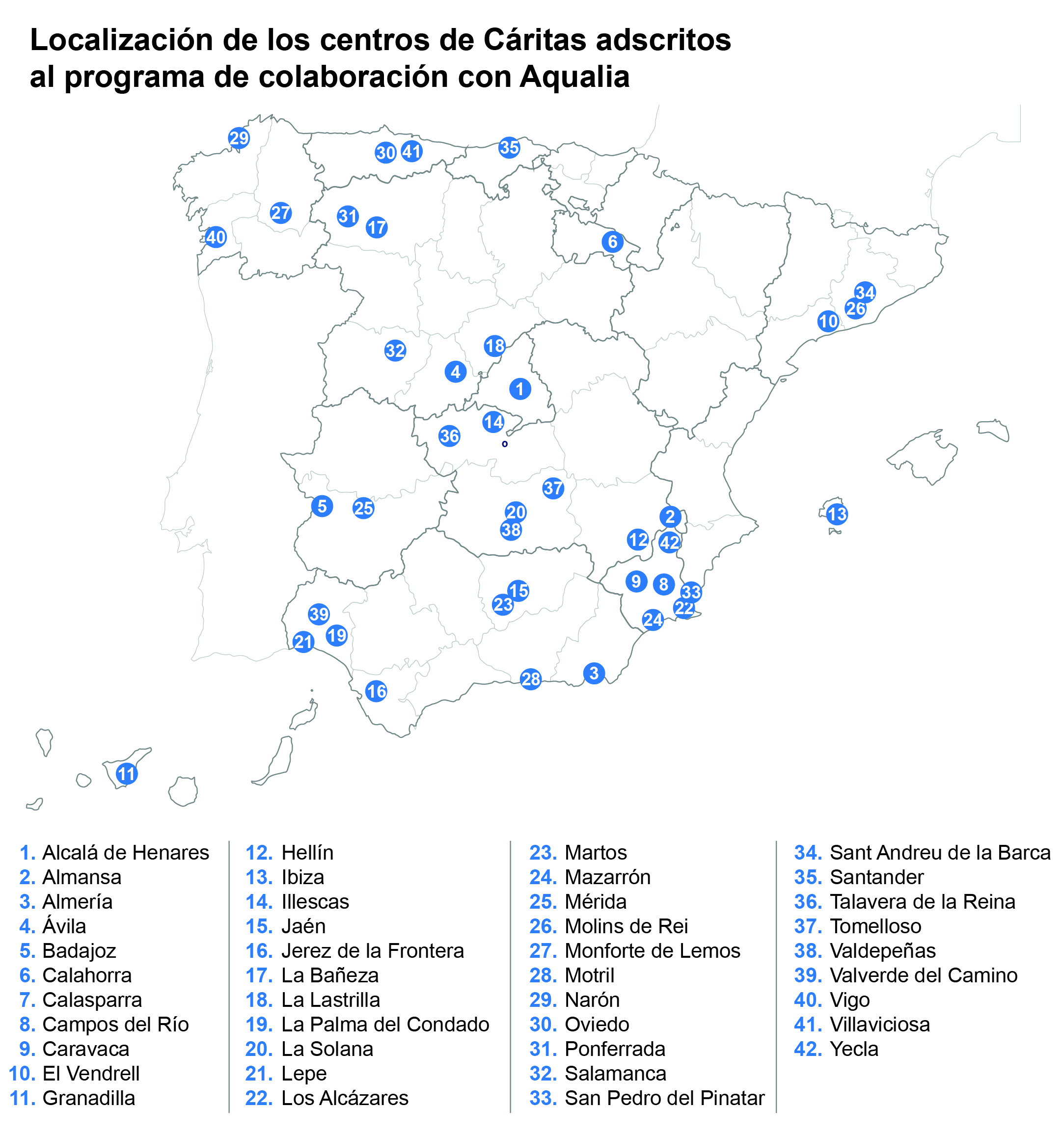 Aqualia paga la totalidad de la factura por el servicio de agua, incluyendo además conceptos ajenos a su actividad que pueda contener la factura, como el canon de saneamiento, basura, canon autonómico, etc. Este año, la alianza entre ambas organizaciones se ha articulado a través de 143 centros de Cáritas, repartidos en 42 localidades de 24 provincias de España. Gracias a esta alianza, las personas en situaciones complicadas pueden recibir ayuda y acompañamiento para salir de esa situación.